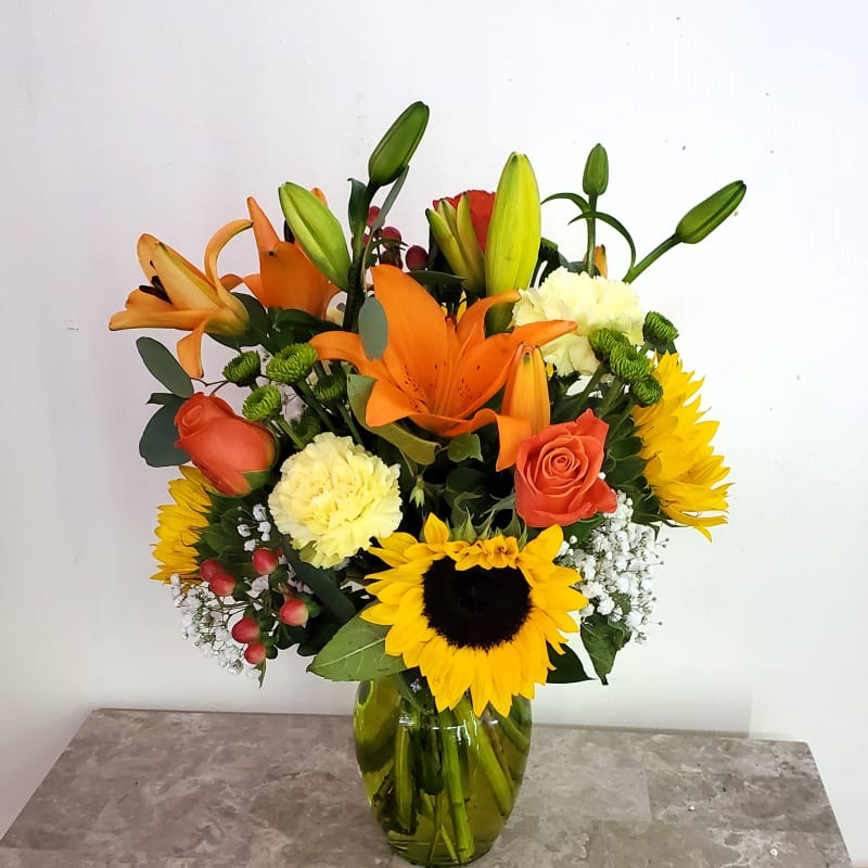 The arrangement was beautiful and the owner delivered the flowers personally. She went above and beyond when she noticed that the facility only had one set of doors open. She reached out to me to give notice to the other guests about the set up and I really appreciated the gesture.
